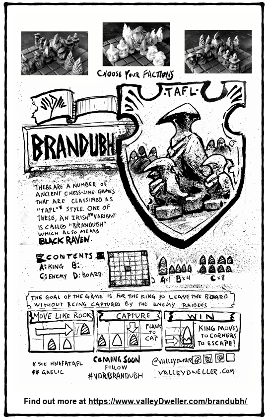 Gromblings... ...is a reskin of Brandubh where there's a boy and his fuzzy pals, who are trying to escape a town under siege by lil' reptilian duders. The Unpainted Resin Prototype includes Boy, four Fuzzes, and eight Lizzies with a poster gameboard that includes rules summary (as seen below). Gameplay is as listed above. | ||